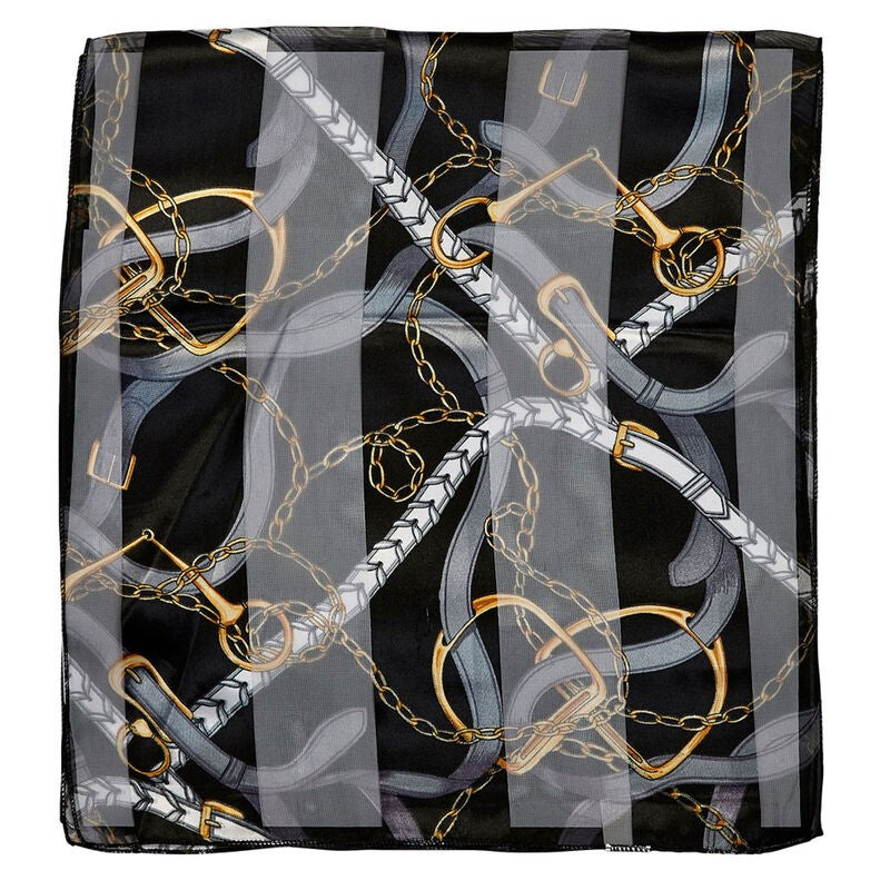 Satin stripe, English scarf featuring bits, reins and stirrup irons.
